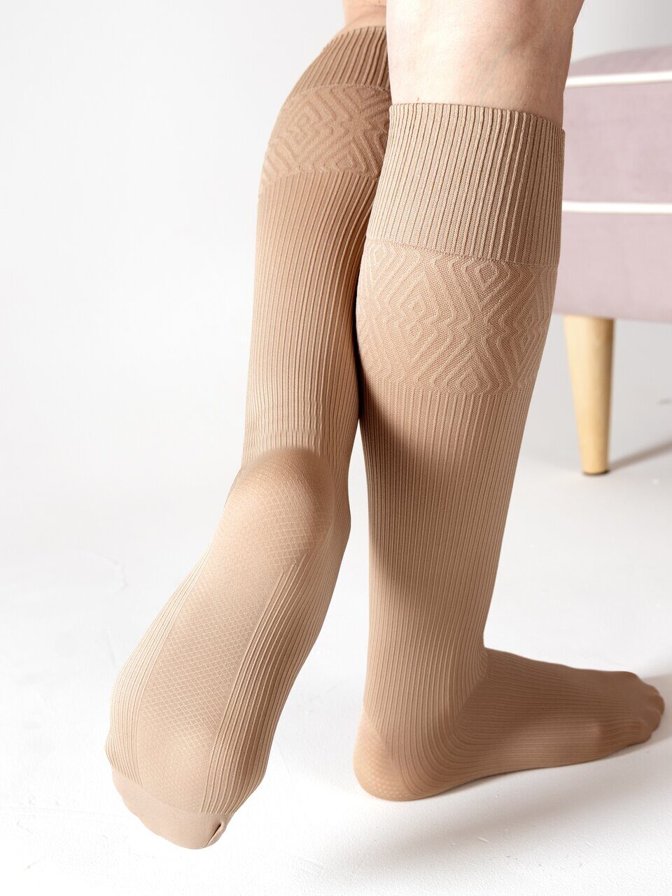 Гольфы (получулки) ПРОФИЛАКТИКА 140 den 1 класс компрессии рекомендованы для лечения начальных проявлений хронической венозной недостаточности, улучшения кровообращения в ногах, для снятия отеков, а также беременным женщинам. Подходят для повседневной носки. Имеют трубчатую вязку, усиленный мысок, без отдельно вывязанной пятки, не прозрачные. Сверху не резинка, а широкий отворот, не пережимающий ногу. На отвороте красивый геометрический рисунок. Мягкие, комфортные, износостойкие, не дают стрелок. Хранить при температуре от +5 до +40°С и относительной влажности 75%. Стирать в теплой воде, сушить отдельно. Срок годности 3 года.