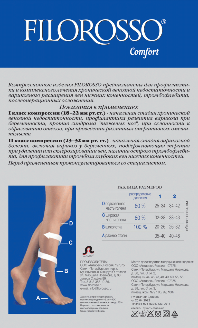 Лучше надевать в утреннее время на отдохнувшие ноги. После надевания на стопу и пятку не тяните за верхний бортик, а постепенно расправляйте по ноге, равномерно натягивая. При затрудненном надевании можно смочить руки водой или воспользоваться латексными перчатками. Модель очень ноская, высококачественная, не дает стрелок, очень популярная. Прекрасная альтернатива дорогим импортным аналогам. Лучше проконсультироваться с мед. специалистом для правильного подбора компрессии. Хранить при температуре от +5 до +40°С и относительной влажности 75%. Стирать вручную при 40 градусах. Срок годности 3 года.